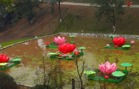 (东乡镇在红军公园布置大型“莲阵”雕塑)