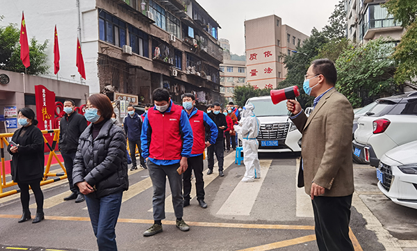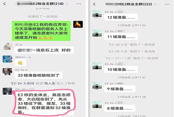 “E2栋的全体业主,我是志愿者,大白现在到了,先从33楼往下做,接龙,33楼做时,在群里接龙通知32楼准备……”
