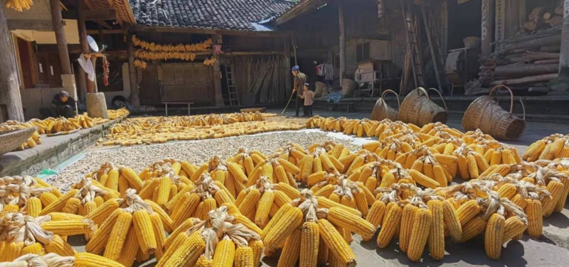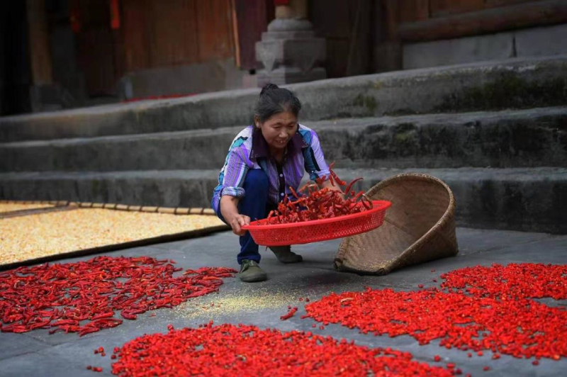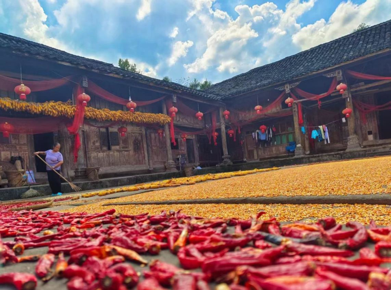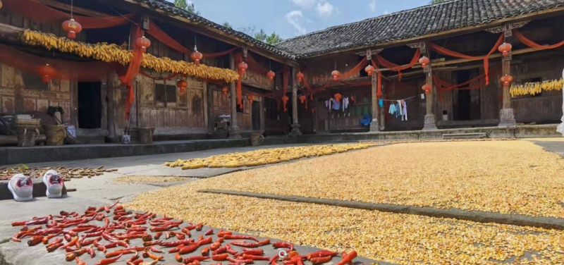 岁岁年年晒丰收,晒出的是满满的幸福、浓浓的乡愁。那金灿灿的玉米串在阳光下耀着金光,成为了最精美的田园挂饰。那火红的辣椒映红了农家小院,也照亮了太平坎人红红火火的小康路。